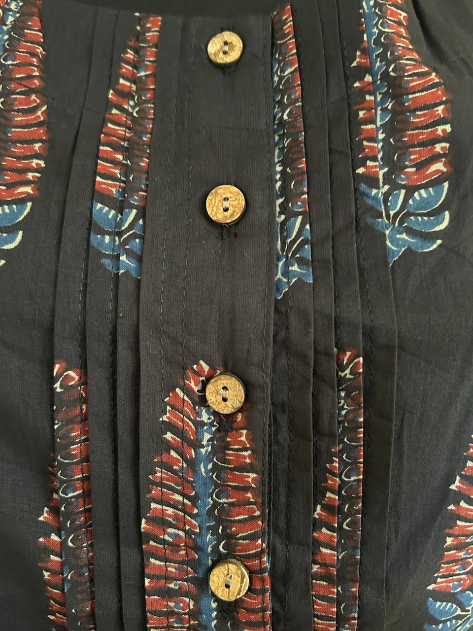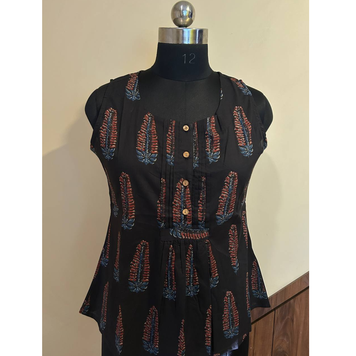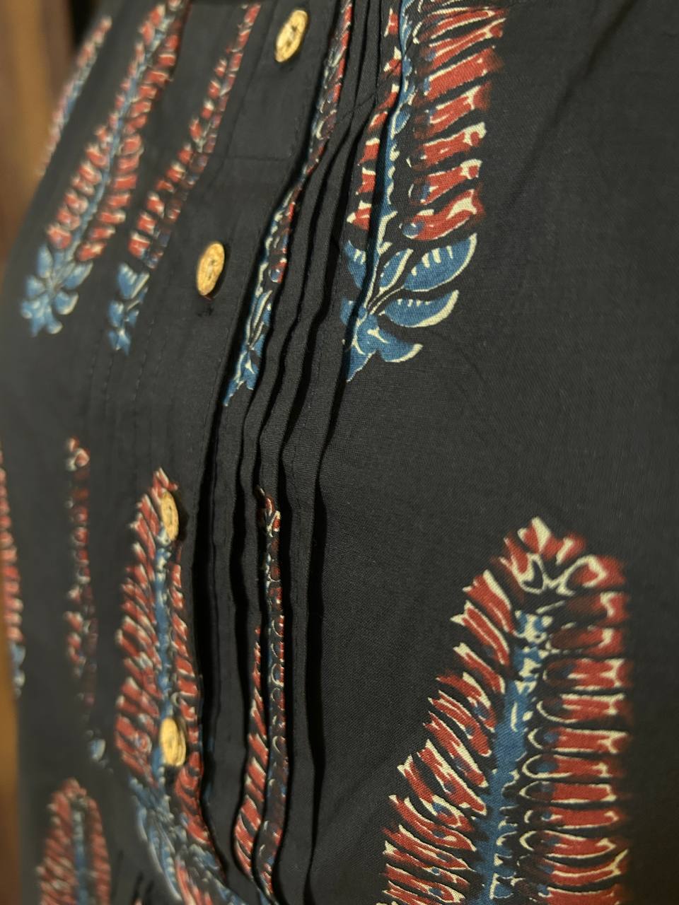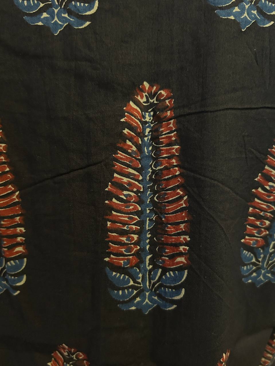 Fabric & Print: Premium quality cotton featuring an intricate Ajrakh print in a classic black and earthy red color palette.