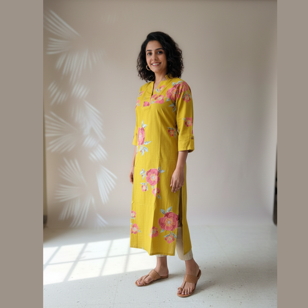 Styling Tip: Pair it with neutral cigarette pants or beige leggings and tan kolhapuris to let the mustard yellow pop